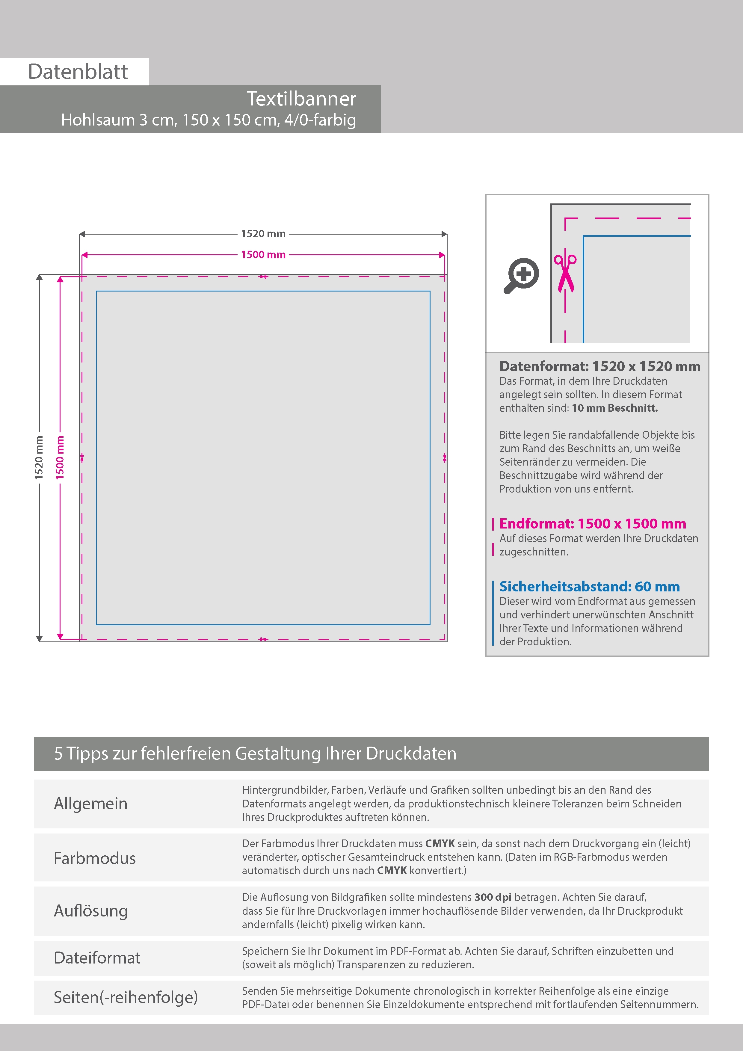 Hochwertige Stoff-Banner 150 x 150 cm, 4/0-farbig bedruckt, Hohlsaum links und rechts (Durchmesser Hohlsaum 3,0 cm)