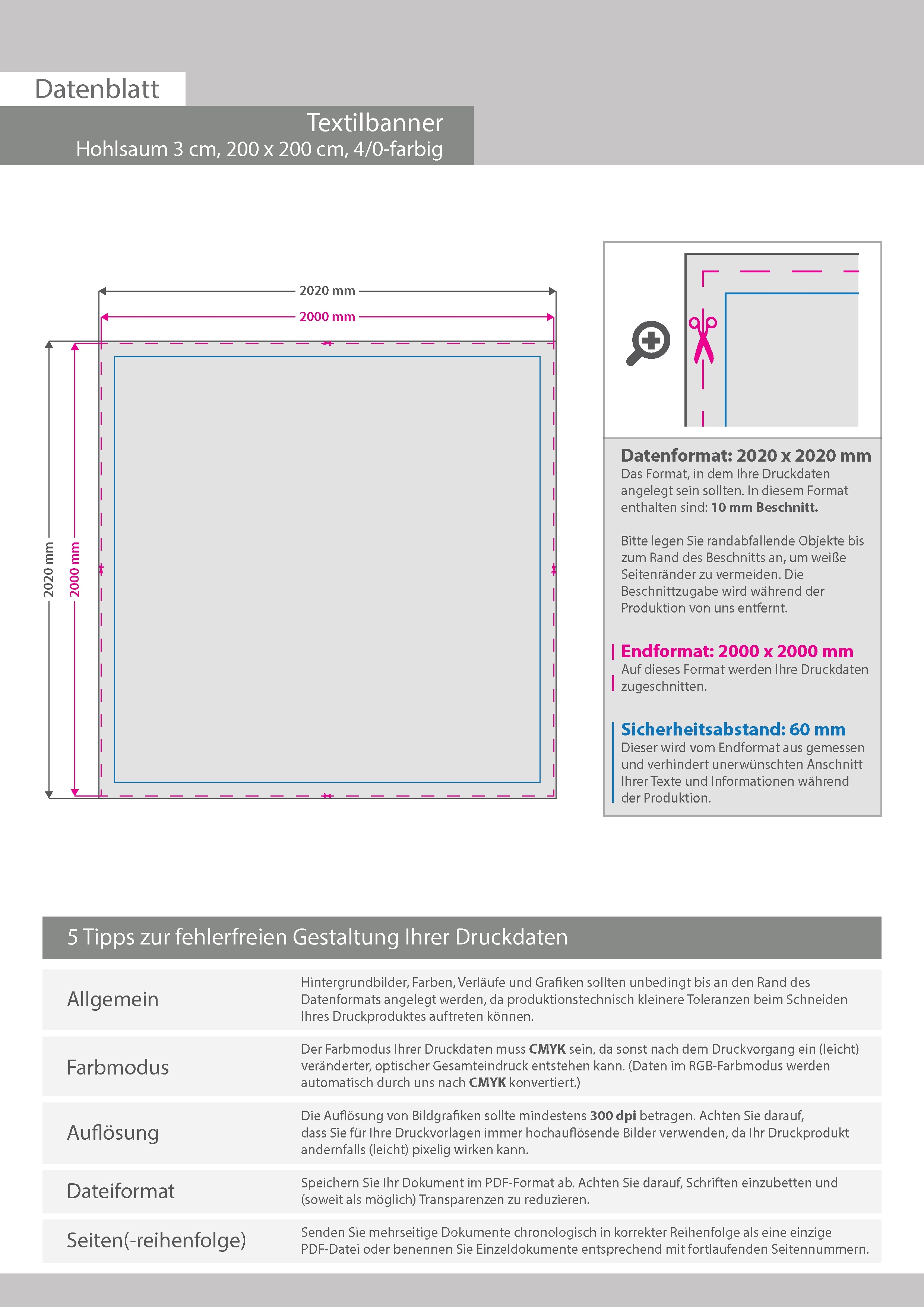 Hochwertige Stoff-Banner 200 x 200 cm, 4/0-farbig bedruckt, Hohlsaum links und rechts (Durchmesser Hohlsaum 3,0 cm)
