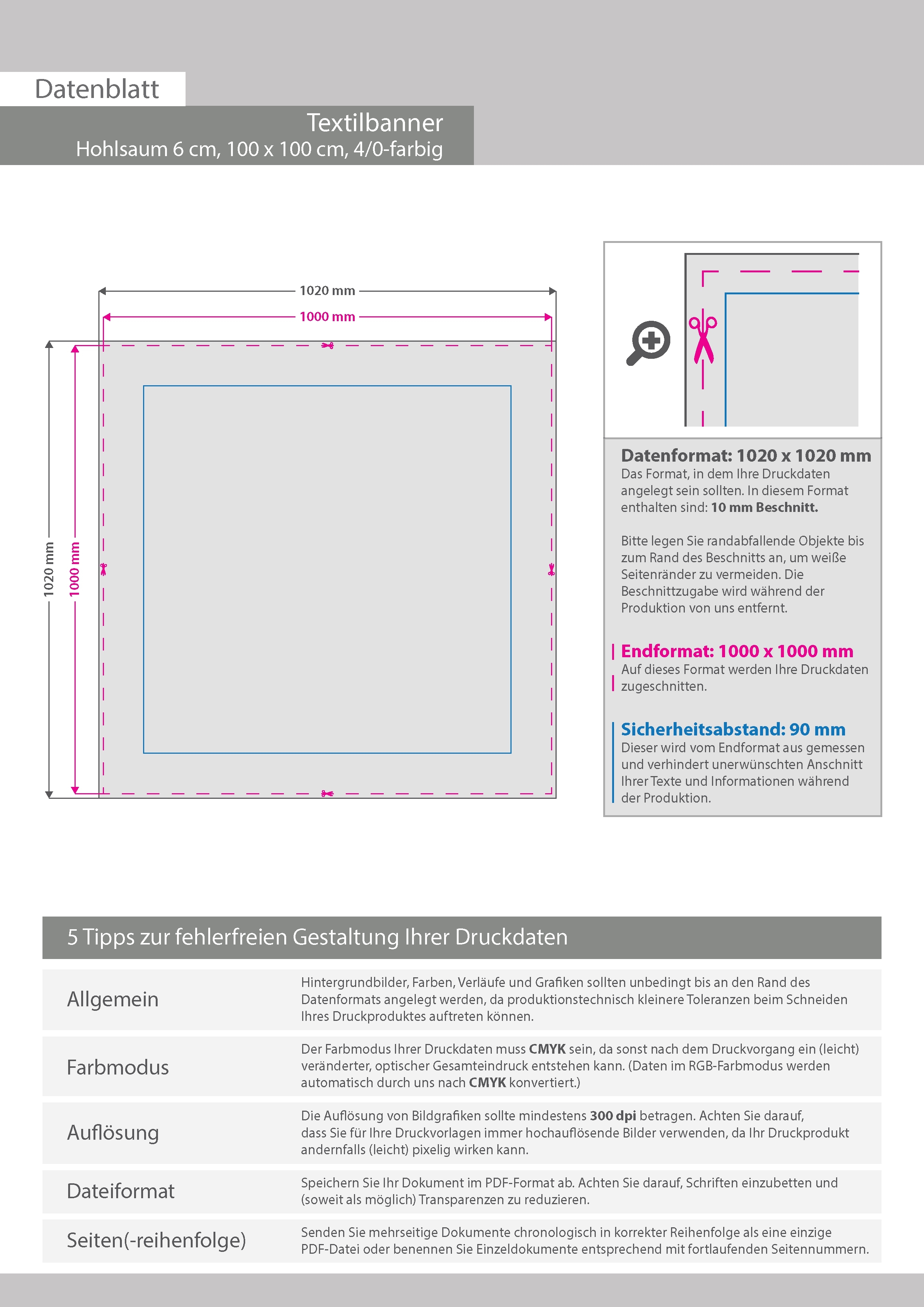 Hochwertige Stoff-Banner 100 x 100 cm, 4/0-farbig bedruckt, Hohlsaum links und rechts (Durchmesser Hohlsaum 6,0 cm)