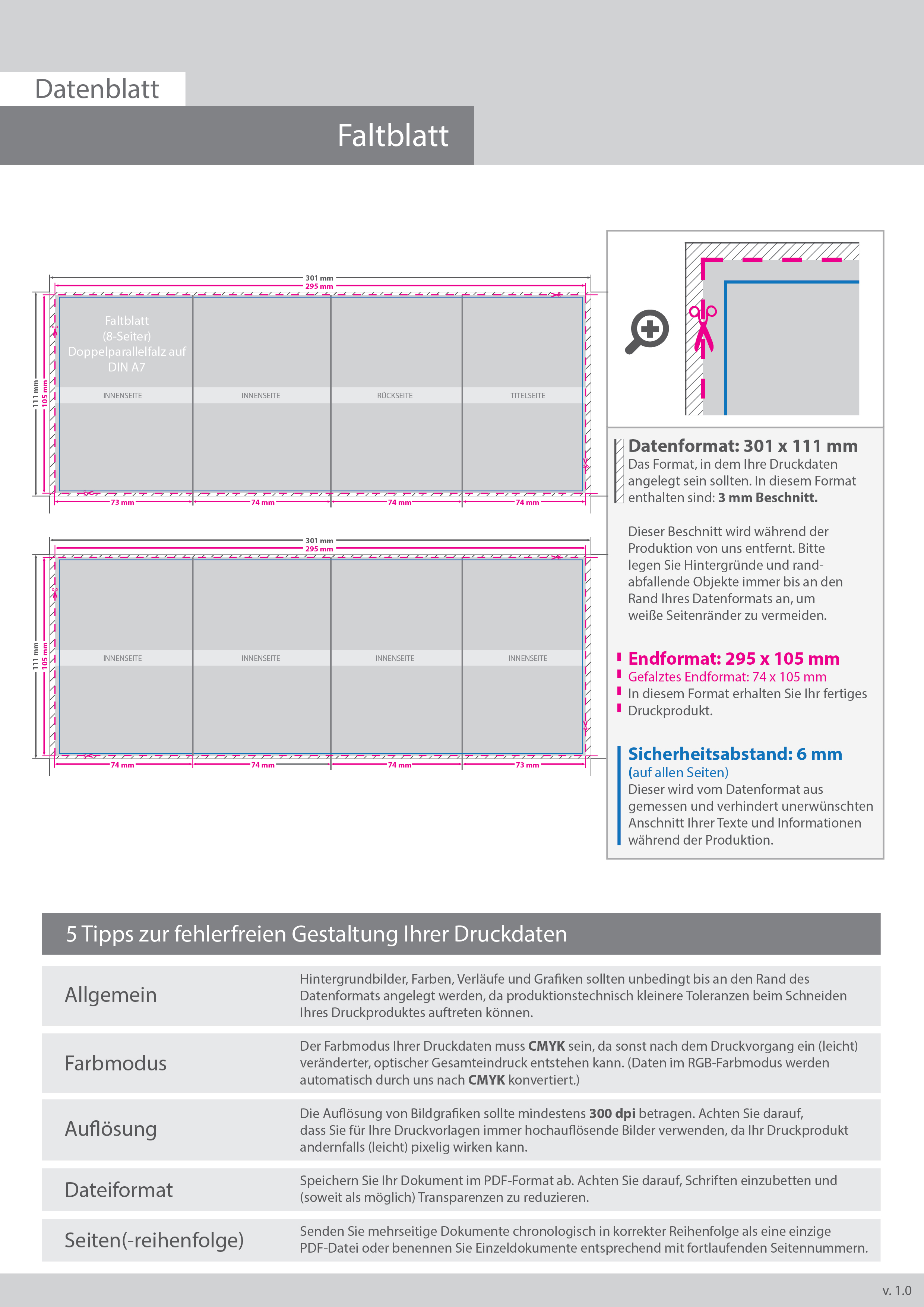 Faltblatt, gefalzt auf DIN A7, vertikaler Doppelparallelfalz, 8-seitig