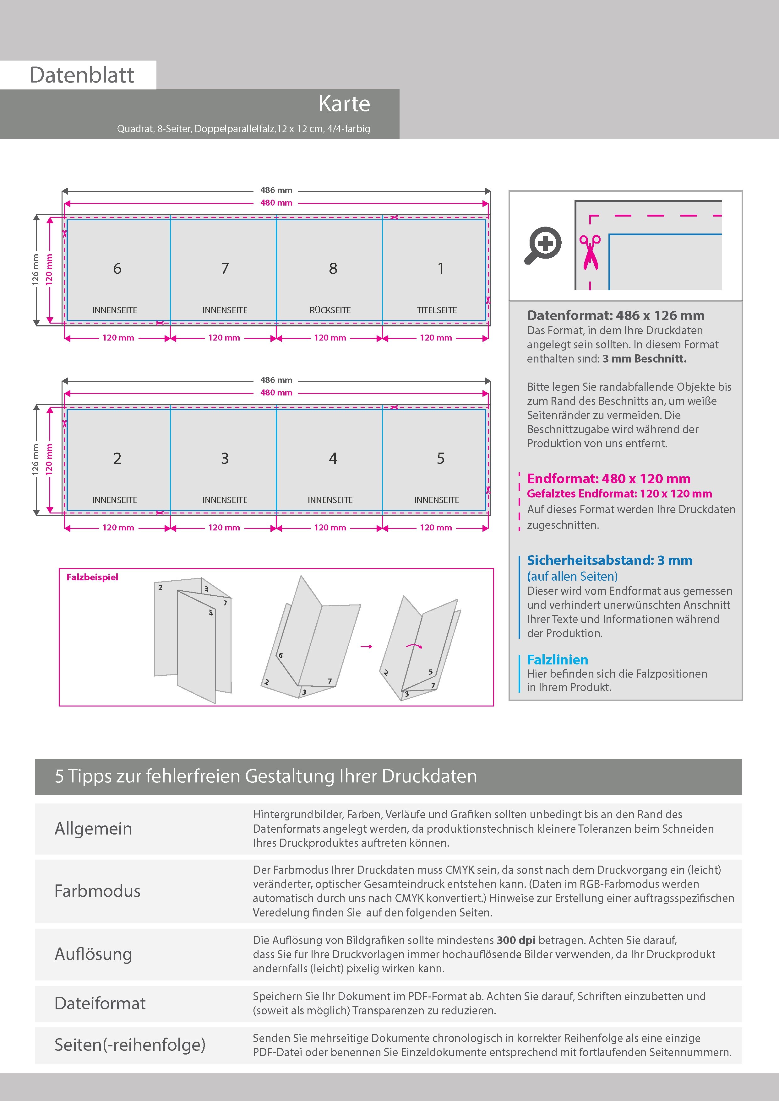 Einladungskarte, gefalzt auf Quadrat 12,0 cm x 12,0 cm, vertikaler Doppelparallelfalz, 8-seitig