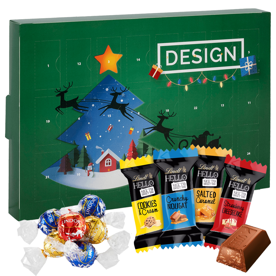 Ideal als Werbegeschenk, als Giveaway oder als Kundengeschenk. Mit Adventskalender schenken Sie immer Freude. Unsere Adventskalender sind ab Auflage 1 bestellbar, somit lohnt es sich auch als personalisiertes und individuelles Geschenk. Feinste Vollmilchschokolade für jeden Tag hinter jedem Türchen. Die Schokolade im Adventskalender kann Spuren von Gluten, Soja und Mandeln erhalten.